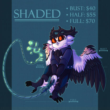 • All commissions (minus sketches) come with a simple colored/patterned background. For illustrated backgrounds / full scene drawings, let me know what you're looking for and I'll give you the additional cost quote!• Every additional character per drawing is half the full cost (ie. a full body sketch with two characters is $30 for one character + $15 for a second, for a total of $45)• I will draw: